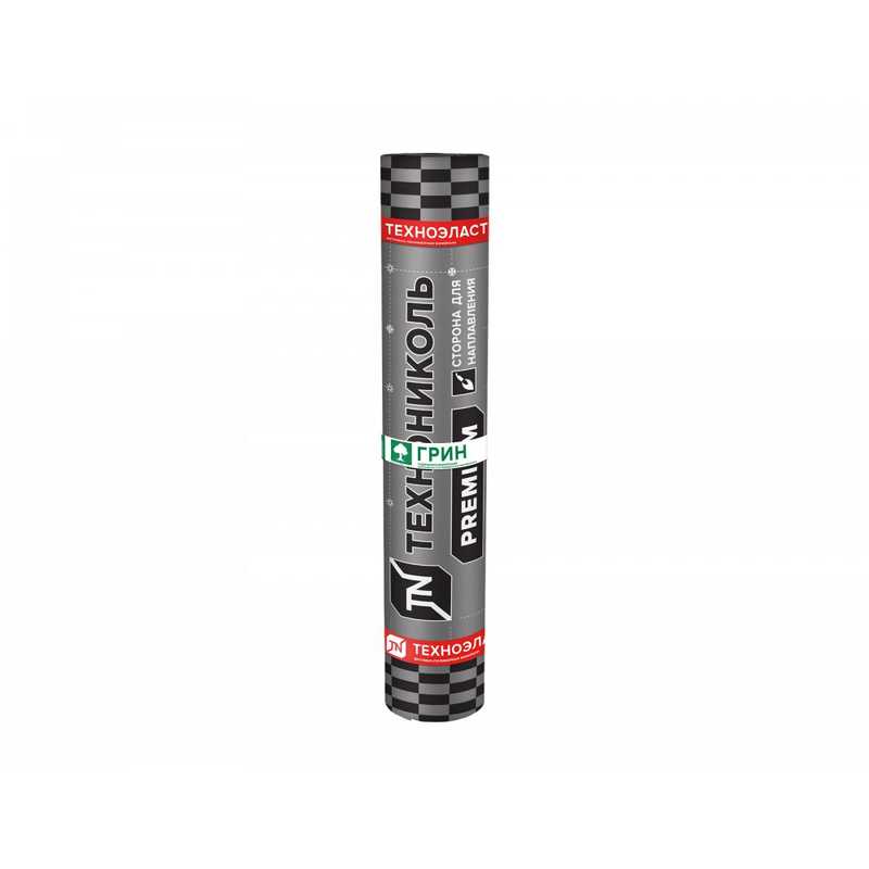 - Техноэласт ГРИН П — с полимерным покрытием с верхней и нижней сторон полотна; применяется для устройства гидроизоляции строительных конструкций и сооружений и устройства крыш с зелеными насаждениями.